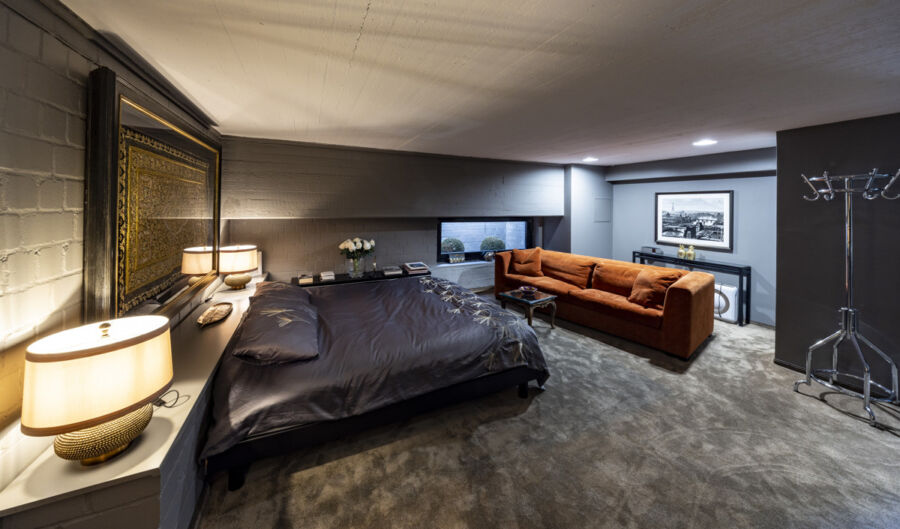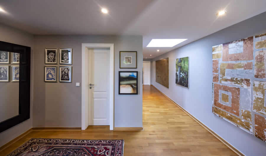 Mitte der 1990er-Jahre wurde das lichtdurchflutete Haus um einen seitlich gelegenen Gebäudeteil erweitert, der 2011 von den jetzigen Eigentümern umfassend modernisiert wurde. Hier entstand ein stilvoller Wohn- und Medienbereich mit großflächiger Verglasung und direktem Zugang zum Dachgeschoss. Das ehemalige Atelier wurde zu einem offen gestalteten Masterbereich mit luxuriöser Hotel-Suiten-Atmosphäre umgebaut. Der Schlafbereich geht fließend in eine komfortable Ankleide mit maßgefertigtem Einbauschrank über. Von hier aus betritt man eine großzügige Dachterrasse mit herrlichem Fernblick – ideal zum Entspannen. Ein hochwertig ausgestattetes Bad mit freistehender Wanne, Walk-in-Dusche, Doppelwaschtisch und separater Toilette rundet diesen privaten Rückzugsbereich ab.