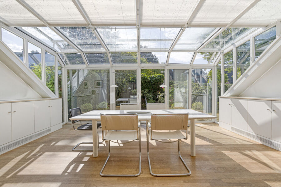 Bereits beim Betreten des Hauses empfängt Sie ein komfortabler Dielenbereich mit einer Einbaugarderobe, die für Ordnung sorgt. Von hier aus gelangen Sie sowohl in das hell geflieste Gäste-WC als auch in die Küche sowie in den besonders großzügigen Wohn-Essbereich. Im Zuge der Errichtung des Hauses sind unter anderem die Erweiterung des Wohn-Essbereichs durch den vollverglasten Wintergarten mitsamt innen- und außenliegender Beschattungsanlage und hochwertigen Tischlereinbauten in Zusammenarbeit mit einem Innenarchitekturbüro entstanden. Er bildet das lichtdurchflutete und einladende Herzstück des Hauses und bietet neben Stauraum auch Platz für einen großzügigen Esstisch. Der Wintergarten lässt sich über zwei große Schiebetüren zur Terrasse hin öffnen und verbindet so das Innen mit dem Außen.