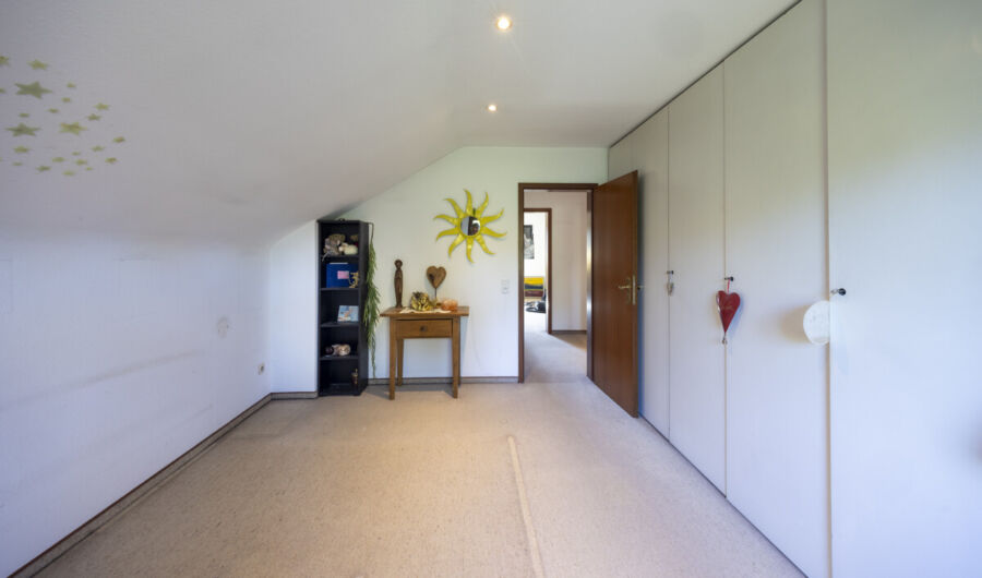 Im Dachgeschoss erwarten Sie insgesamt drei Zimmer, die sich ideal als Elternschlafzimmer, Kinder- oder Arbeitszimmer eignen. Das moderne, tageslichthelle Badezimmer ist mit einem Doppelwaschbecken, einer Badewanne und einer Dusche ausgestattet.
