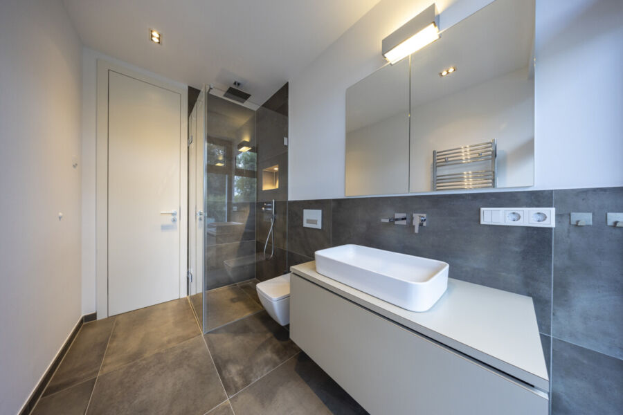 - Maßgefertigte, flächenbündige Spiegelschränke in den Bädern; wandfüllende Spiegelfläche im Gäste-WC