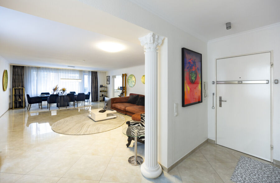 Über das Treppenhaus oder bequem mit dem Aufzug gelangen Sie zur Wohnung. Beim Betreten empfängt Sie eine großzügige Diele, die ausreichend Platz für eine Garderobe bietet und mit praktischen Einbauschränken ausgestattet ist.